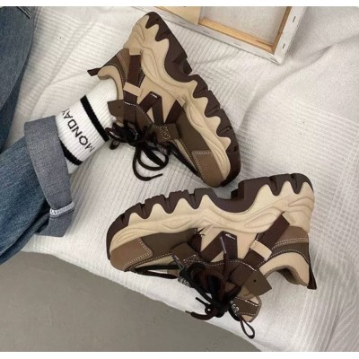 Модні жіночі масивні кросівки на товстій високій підошві - коричневі з бежевим